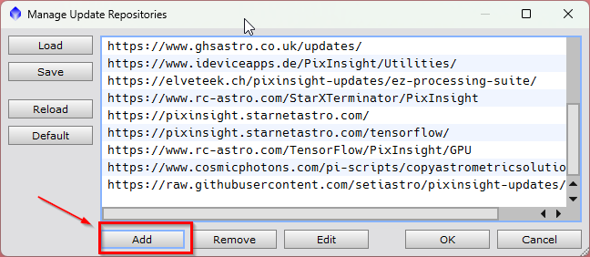 - In PixInsight, go to Resources > Updates > Manage Repositories